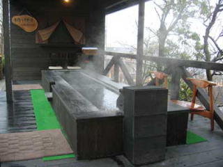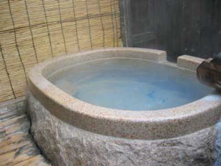 | 部屋の露天風呂は、小ぶりながらもお湯が絶え間なく溢れていて、一人でのんびり入るには十分。 ここのお湯は、時間が経つと色が変わっていくらしい。 この時は、薄い青。 |