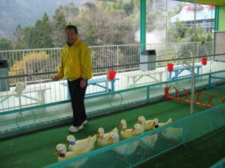 | スリル満点のケーブルカーを降りると、そこがもう遊園地。 入ってすぐ左に、ラクテンチ名物の「あひるの競争」がある。 これは、走路を走るアヒルの着順を当てるっていう簡単なものだけど、いっちょまえに競馬でいうパドックの時間帯もあり、歩くアヒルたちの様子を見て、首につけてるリボンの色にかける。 @100円也。 で、見事当たると景品をもらえる。 |