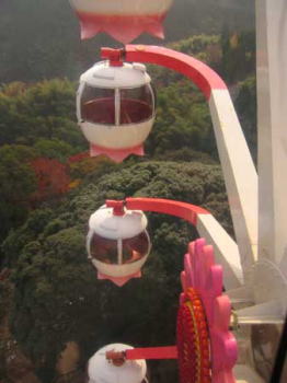 | 最後に、ケーブルカー上駅のすぐ近くにある観覧車に乗ってみることにした。 ここは、普通の円い観覧車の形じゃなくって、タコ型のゴンドラが、伸びたアームの両先に円形になってついてる。 アームの両方に、小さな観覧車が2基ついてるイメージ。 一体どんな動きをするんだろ? 興味津々。 ・・・・・こ、こわい。。。 普通の観覧車のようにゴンドラが並んでる円形にクルリンとゆっくり回りつつ、アームが上下反転するのだ。 この上下反転が怖い。 ゴンドラは回り続けてるので、その動きと、アーム反転の異なる動きが重なって心臓にくる。 観覧車といえばほのぼのした乗り物だと思ってたけど、これはほのぼのどころじゃない。 「う゛〜っ,ごわ゛い゛〜〜〜っ」 と唸りつつ、思わずゴンドラの手すりをつかむ。 |