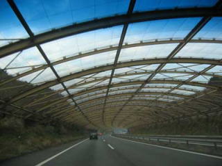 | 高速道路一面が屋根に覆われてるのは、ゴルフコースの横を通るため。 飛んできたゴルフボールによる事故を防ぐもの。 |
