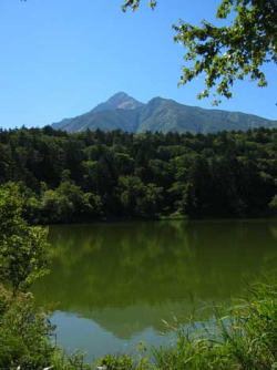 湖面には、原生林の向こうに見える利尻山がその姿を映している。