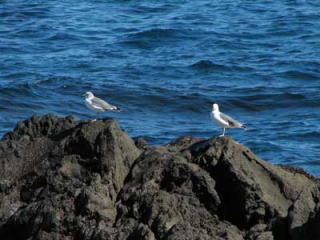 | カモメやウミウが、あちこちにいる。 | ここから望む山は姿を変えてゴツゴツしている。 火山活動のあった山らしい姿だ。 |