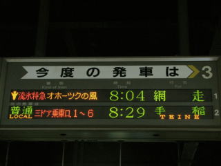 | 6時起床。 札幌駅で朝食を取り、昼食用の駅弁を購入して、流氷特急オホーツクの風に乗り込む。 目指すは網走。 |