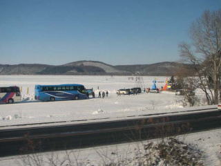 | 終点が近付いてくると、進行方向左手に網走湖が姿を現す。 凍結して真っ白だ。 冬季に開催されている「あったか網走」の会場も、ここから流れ出す網走川も列車から眺めることができる。 |