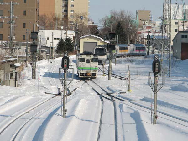 | 列車は、順調に網走に到着。 ここから、流氷ノロッコ号に乗り換えて、北浜駅を目指す。 |