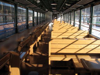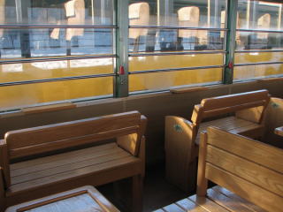 | こちらがトロッコ車両。 2人がけのベンチシートはオホーツク海に向けて設置されている。 トロッコ客車、普通客車ともに、自由席があった。 |