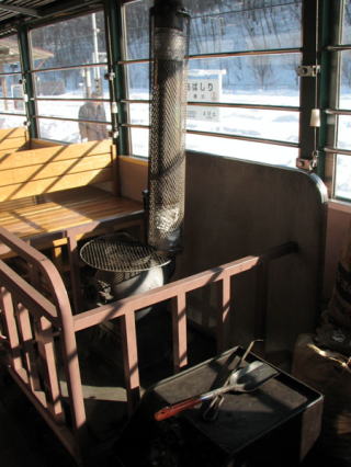 | 年代によっては懐かしいであろうダルマストーブ。 出発すると、ここでイカを焼いている匂いも漂ってくる。 ちなみに、イカは車内の売店で売ってるので、買ってこなくても大丈夫。早いもの勝ちだけどね。 |