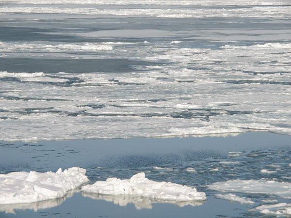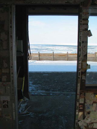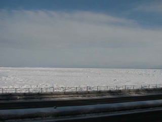 | やがて、窓一杯に白い海が現れた。流氷だ! 初めて見る凍った海にテンションは高まる一方。 さらに列車が進むと、青い海に変わる。 北浜に流氷は接岸しているのか・・・? 期待と不安が入り混じる。 あっという間に列車は北浜駅に到着。 海は・・・・、白い!!! |