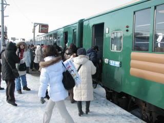 | 列車を降りると、すんごい人人人! 無人駅のホームが人でふくれている。 どうやら、団体客がここまでバスで来て、ノロッコ号に乗り込むようだ。 この列車の行き先は世界遺産を抱える知床斜里駅。 きっとそこでまたバスが待っているのだろう。 |