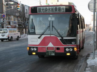 | 今回の行程中、唯一がっつりと予定を組んだ3日目の始まり。 まずは、8:00発の砕氷船おーろら号乗船へ。 出発準備を整え、バスセンターで砕氷船のりば行きバスを待つ。 8:00発の砕氷船おーろら号は臨時便。これが運行される時は、網走バスもそれにあわせて臨時便が運行される。 やってきたバスを見ると・・・。 うげげっ!超超超満員!!!!! みんな網走駅から乗ってきたのか??? 朝早い便なら人も少なかろうと思っていたけど、読みが甘かった。 |
