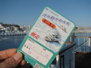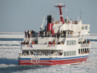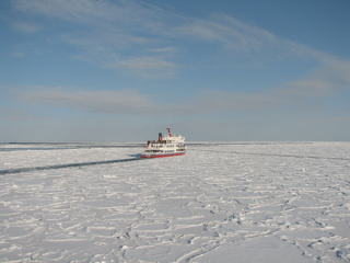 | 1時間弱の航行を終え、無事に上陸。 最初は「短い?」と思ったけど、寒さ的にこれが限界だと納得。 それにしても、綺麗だったなー。 正直、乗る前は、陸からも流氷見たしあんまり変わんないじゃないの?なんて思ってたけど、とんでもない! 海上に出て見る流氷は、また違った眺めで、海の上にいるのに一面びっしりと白い世界は砕氷船ならでは。 いやー、乗ってよかった。 大満足!! |