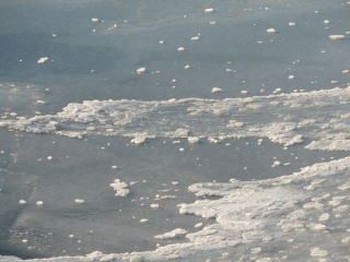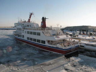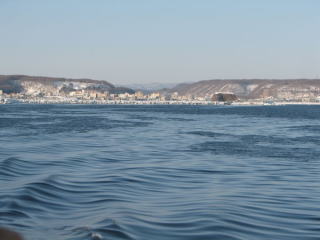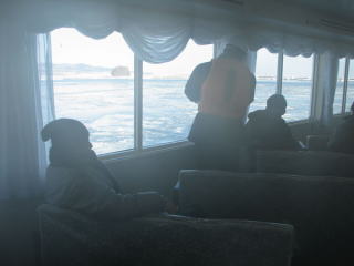 | 湾内は、薄く氷が張っている程度。 おーろら号の航路は、氷の張り具合によって、沖合まで出ることもあれば、湾内を2周することもあるそう。 今回は、沖合いまで運行するコースのようだ。くふっ、うれちいな。 |