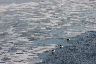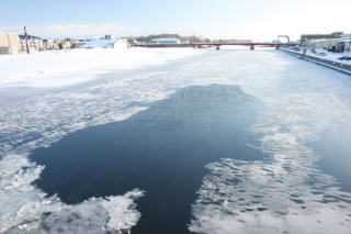| せめてもと、網走川へ散歩へ出かけると、“けあらし”が。 0℃程の水温より、気温の方が低いため、水蒸気となる現象だ。 それもそのはず。この日の網走の最低気温は−11.1℃ |