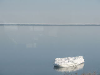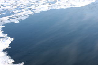 | それはともかく、汽車は定刻に出発した。 2日前に堪能した北浜駅が近付いてくる。 ありゃっ!流氷がない!! ポツンと1つ、海に取り残されたものが浮かんでいるだけ。 流氷は1日で去るとは聞いていたけれど、それを目の当たりにすると何だか不思議な気もする。 ここで随分な人が降りたものの、逆に乗ってくる人もあり、やはり列車は満員。 |