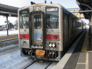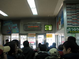 | 改札が開くと、皆ダッシュ! 階段で既に撃沈した私は、殿に望みを託し、背中を見送りつつ、それでも一応精一杯走ってみる。 ゼーゼーハーハー言いながらヨレヨレで列車に到着すると、チョコンと殿が座っていた。 いや〜、よかった! よくぞ取ってくれました!! ここから釧路までは3時間以上。立ちっぱなしはさすがにきついぞよ。 車内はぎゅうぎゅう。 |