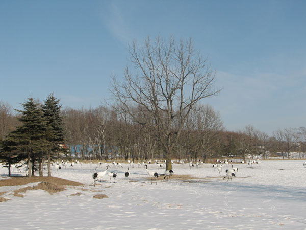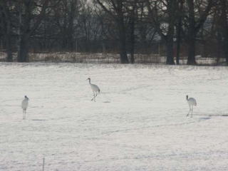 | いた!! 丹頂鶴!!! 3羽仲良くボーッと立っておりますっ! 今は無人駅となった茅沼駅だけど、有人だった頃に丹頂の餌付けをしたお陰で(今でも餌は置いてあった)数羽が住み着いているよう。 網走から釧路に向かって、右手に餌付け場所があり、今回も右の車窓から鶴を見ることができた。 |