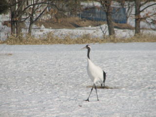 | と、空から鶴が舞い降りてきた。 すごい! こんな人が生活を営んでいるところを鶴が飛んでるなんて。 「日本昔話」の世界だよ。 もっと見ていたい・・・と後ろ髪を引かれる思いで、出発時間になったバスに乗り込む。 外国人以外は既にバスに乗り込んでいて、皆そう興味もない様子。 あ゛ーっ、もっと時間がほしかった! しかし、かつてバスガイドをしていた私は、出発時間前でもある程度の人が揃うと、戻ってきていない人を待って車内がピリピリとした空気になってくることが十分に分かっている。 あれを思い出すと、鶴を見てても時間が気になって気になって仕方ない小心者なのだ。 うーむ、私たちはやっぱり個人旅行向きである。 まあ、改めて自分たちに合っている旅のスタイルを、1ヵ所しか停車しないこのバスで確認できたのは良い経験だった。 |